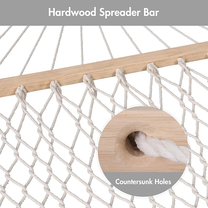 - SPREADER BAR HAMMOCK: 52 inches hardwood spreader bar has countersunk holes, hence reducing the friction between the rope and wood, offering maximum durability and stability. Our hammock significantly outperforms others’ non-countersunk varieties