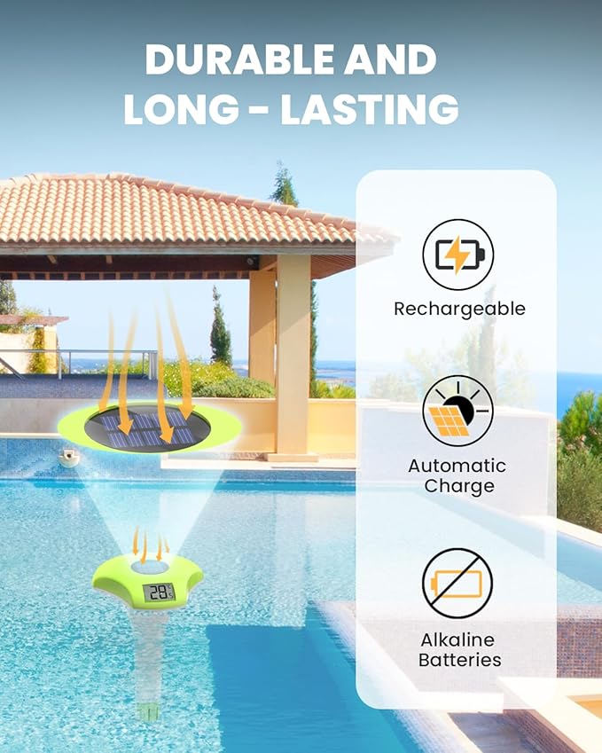 - 🍋DURABLE AND LONG-LASTING: Featuring a built-in lithium battery and solar panel, our solar-powered pool thermometer is rechargeable and easy to use. Simply place it in an area with ample daylight for automatic charging-eliminating the need for alkaline battery replacements.