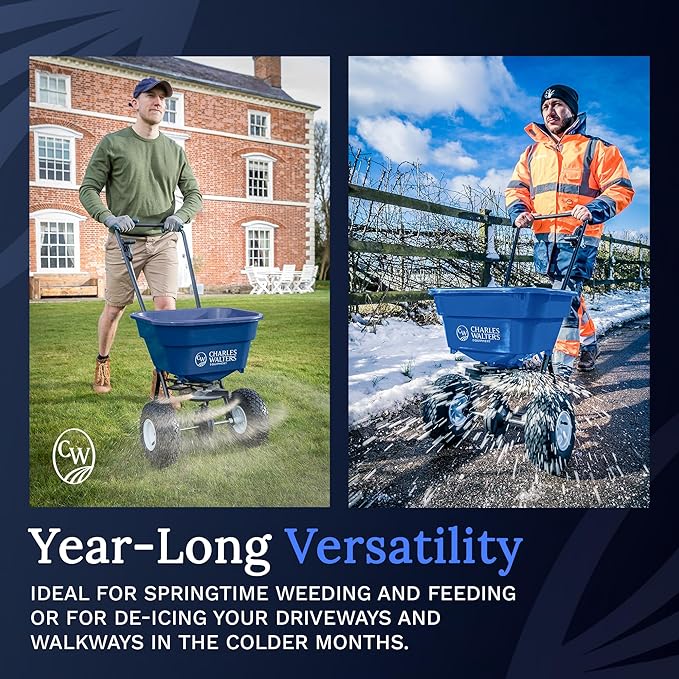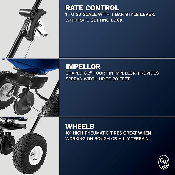 Charles Walters Equipment CW2000 Estate Style Broadcast Spreader for Spreading Fertilizer and Ice Melt on Lawns, Sidewalks, and Driveways, 65lb Capacity, 35" x 35"