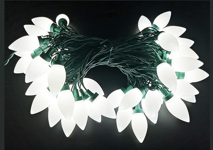 - [Warm Decoration] C9 Christmas lights can be used outdoor and indoor. It's a very nice Christmas decoration, can be used as Christmas Tree, Balcony, Bedroom, Patio, Garden, Holiday, Party. Light up cool white c9 lights, LED light through the c9 smooth bulb, the light is soft and fairy, very beautiful. LED lights are low heat generate, bring you a relax.