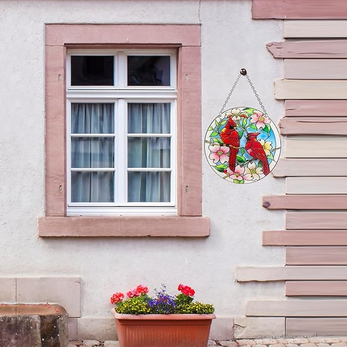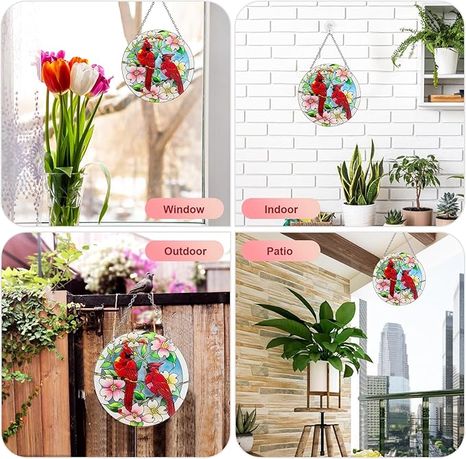 - PERFECT ANYWHERE - This cardinal bird stained glass is sure to be a beautiful sight to hang in your garden, patio, balcony, window, hallway, entertainment venue and more. Cardinals suncatchers can also be used to decorate bedrooms, living rooms, gardens, terraces, and anywhere that needs to add a beautiful melody to the environment.
