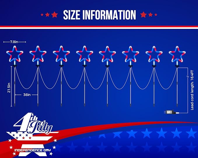 - Fourth of July Decorations Outdoor: 7.8" big neon star with 21.5" stake. 3 feet stake spacing. 16.4 feet lead cord