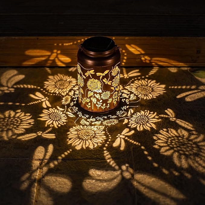 - 【Unique Sunflower Pattern】The hanging solar dragonfly light adopts retro hollow design with warm light with sunflower pattern,casting beautiful patterns on the wall or lawn,Bring life and fun to your garden,a creative gift for family,mom,women and friends during holidays.SIZE:7.20"H x 4.4"W x 4.4"L