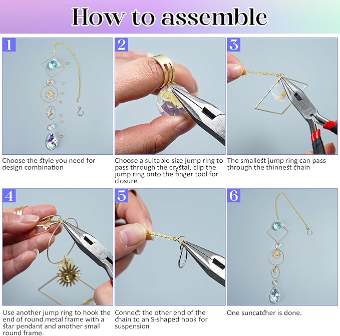 - DIY Crystal Sun Catcher Sets: Our suncatcher assembly craft kit contains the DIY crystal metal materials and tools to make rainbow crystal sun catcher pendants. We have instructions paper to get you started quickly and make your favorite crystal window decorations. At the same time open style so you do not have to limit, you can do whatever you want to match