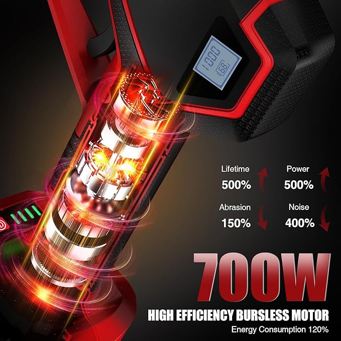 - UPGRADED 700W BRUSHLESS MOTOR: The battery pruner is equipped with a more powerful 700W brushless motor, which has more power and speed, higher load capacity, acceleration and stability, as well as longer service life compared with the low-power copper motors in the market