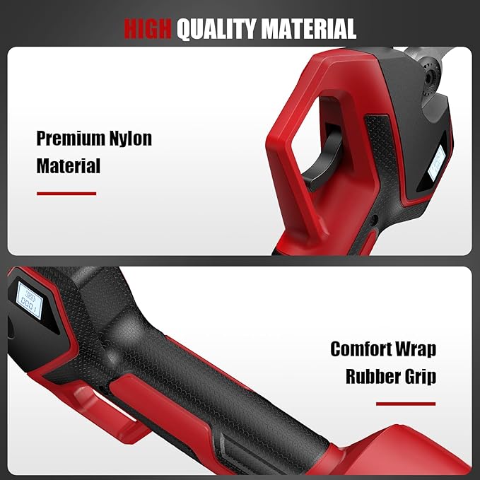 - UPGRADED APPEARANCE DESIGN: The appearance of the battery operated pruners has been upgraded with a premium version of red nylon shell with black overmolded design. This combination not only enhances the texture and premium feeling of the product. In addition, the black rubberized design also enhances the comfort of use.