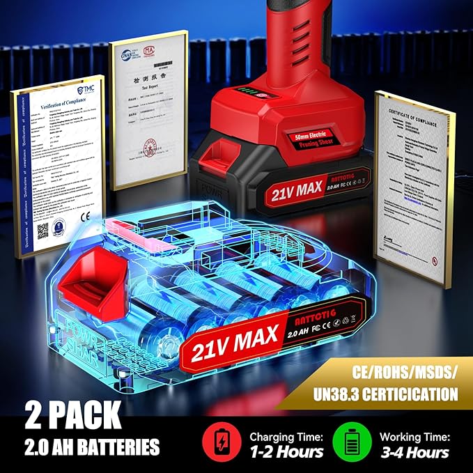 - 2PACK 2000MAH BATTERIES: Equipped with two 21V 2000mAh rechargeable batteries, this gardening pruning shear provides users with long-lasting power support, allowing it to work continuously for long periods of time without the need for frequent recharging, thus improving work efficiency and convenience.