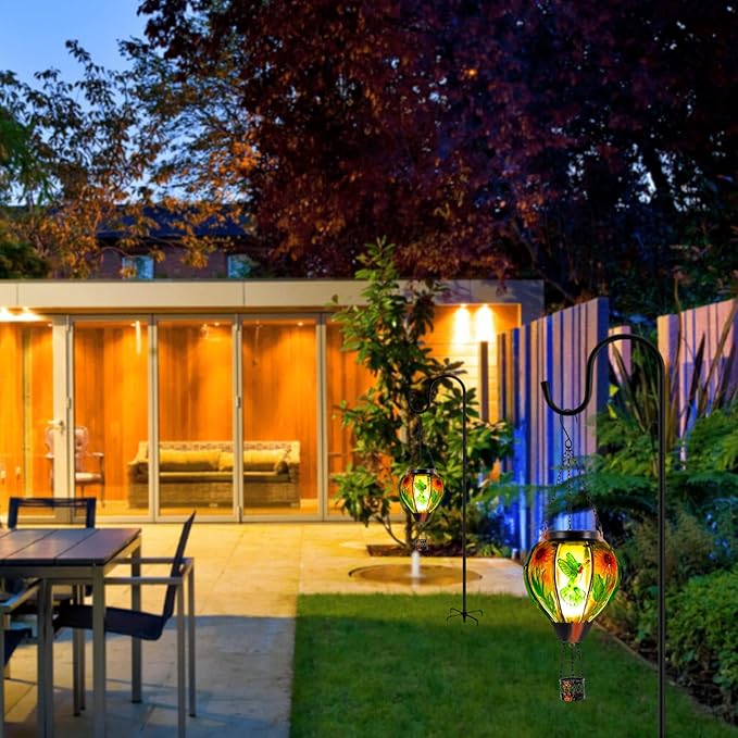- 【Hummingbird Solar Hot Air Balloon】Hummingbirds and sunflowers on our outdoor solar lanterns are brightly colored and cleverly designed, every piece of glass is hand-painted. The hot air balloon solar lantern have built-in flame LED lights that create a realistic simulated flame effect to add color to your garden at night.