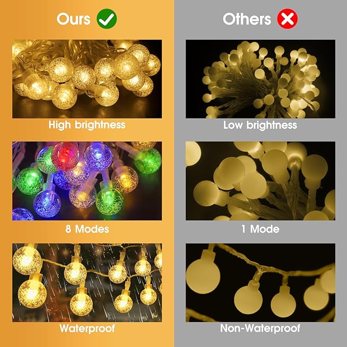 - Upgraded tring Lights:98.4 feet outdoor string lights with 300 Super Bright LED crystal globes. Each globe has a diameter of 17.5 mm, which is much larger than the others. What is the difference? Means you can get higher brightness and more gorgeous lighting effects. Unlike other black wire fairy light, this battery string lights use transparent tube to wrap string, making it consistent with the crystal ball style, which is not make people feel weird