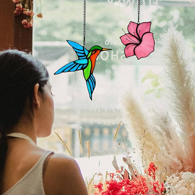 - Handcrafted, REAL Stained Glass: Each hummingbird with flower suncatcher is expertly crafted using vibrant stained glass pieces that are skillfully arranged to create a beautiful and colorful bird design.Also each package includes 2 pieces of different hummingbird with flower suncatcher.