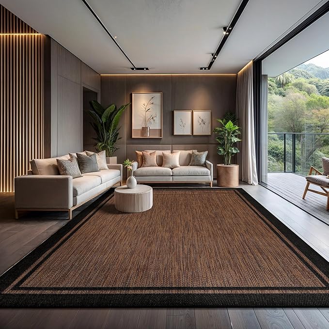 CAMILSON Indoor Outdoor Rug, 10x14 Bordered Nut Brown Black Modern Area Rugs for Indoor and Outdoor Patios, Kitchen and Hallway Mats, Washable Porch Deck Outside Carpet (Border Nut Brown Black 10 x14)