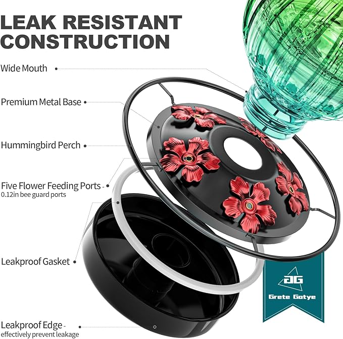 - LEAKPROOF FUNCTION - Build-in durable gasket, unique design makes base connection proper and seamless, even when the hummingbird feeders for outdoors hanging is shaken by wind or birds perching on it. After filling the container and screwing it onto the base, flip it over and hang it on a tree/deck hook/shepherd's hook/hangers/window hook.