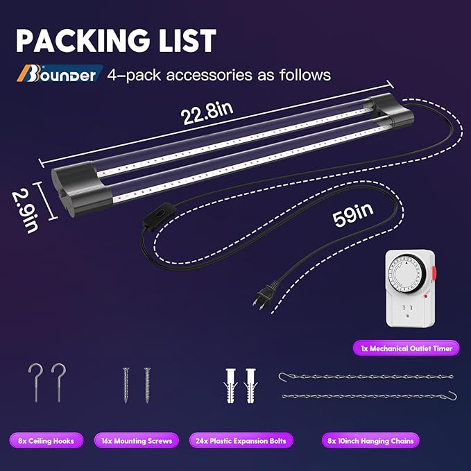 BBOUNDER 2ft 4 Pack Grow Lights for Indoor Plants with Mechanical Outlet Timer, 80W (4x20W, 440W Equivalent), Red Blue Full Spectrum, Linkable LED Grow Light for Hydroponic Indoor Plant Seedling Veg