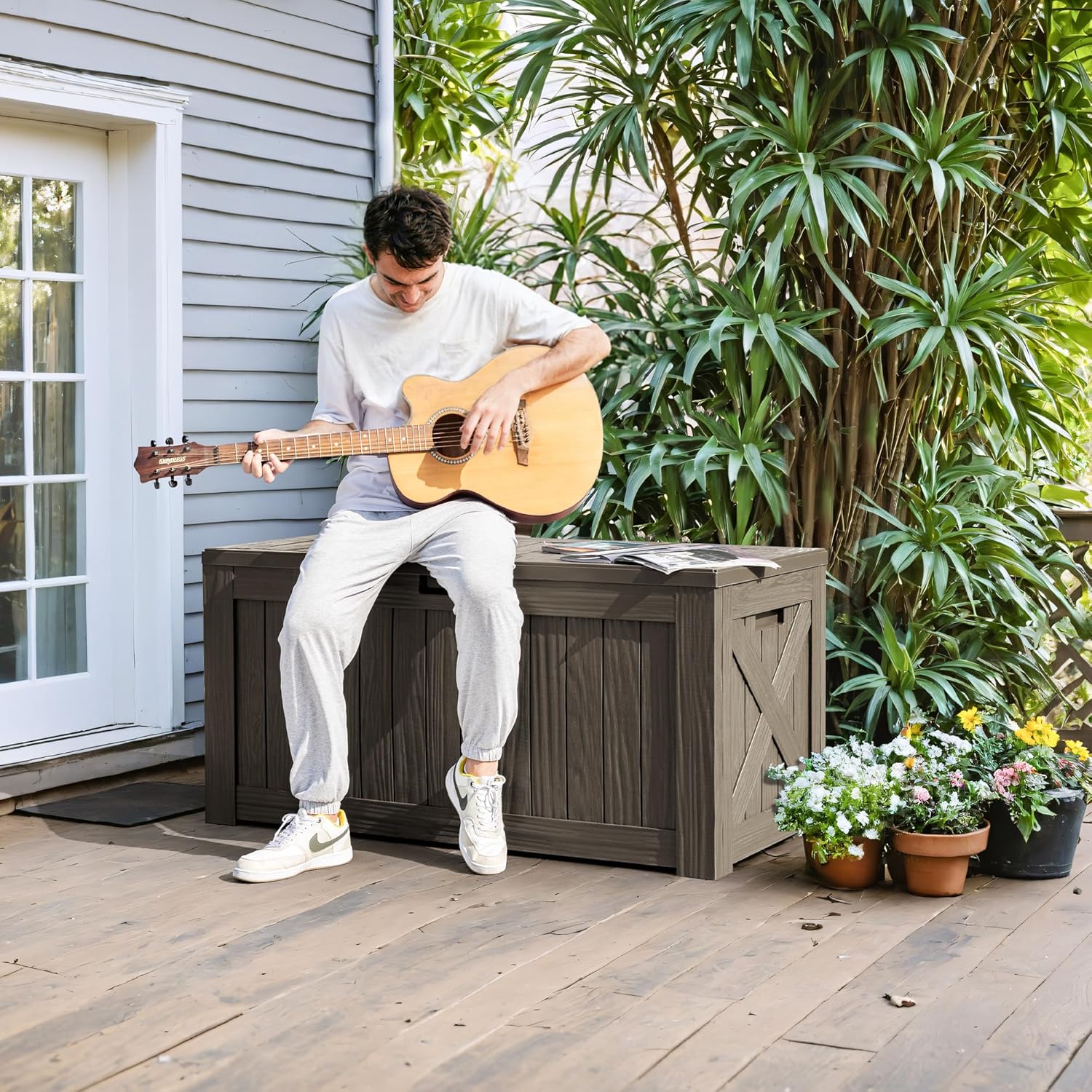 - Good Appearance: There is clear wood grain on the surface of the deck box, which makes it more decorative. Ancient and rustic appearance ensures that it can be a good part of your garden, patio or swimming pool.
