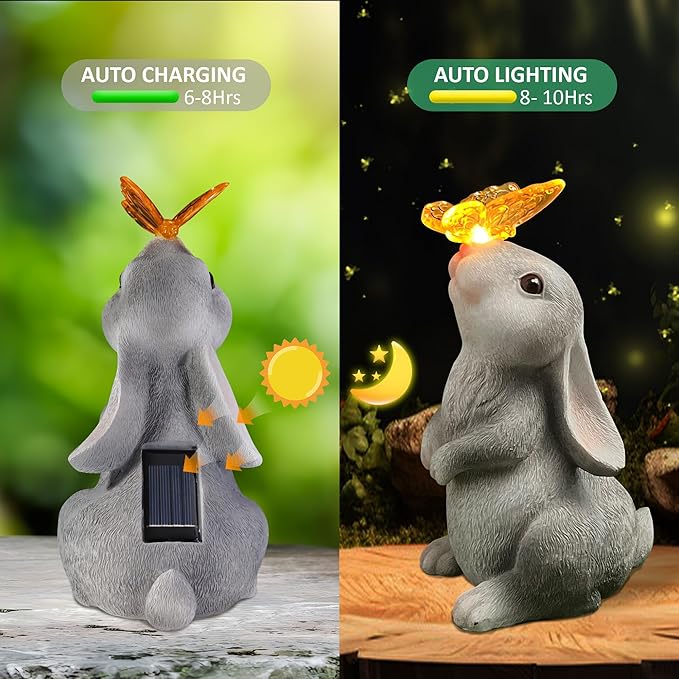 - 【Charming Garden Decor】The adorable garden bunny statue is the perfect addition to any garden. With automatically 7 colors change and an attractive butterfly resting on the rabbit's nose, especially in the garden and courtyard, you can better feel its vitality. This yard bunny decor doubles as a high-quality garden lamp, perfect gift for moms and women