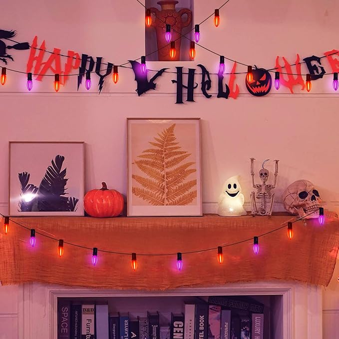 - C9 Halloween LED Lights: Set of 10 C9 outdoor pathway string lights with 10Pcs C9 C9 orange & dark purple light bulbs and 10Pcs stakes. Designed for Halloween decoration. Brighting your walkway with the classic orange & dark purple lights to feelling the Halloween atmosphere.