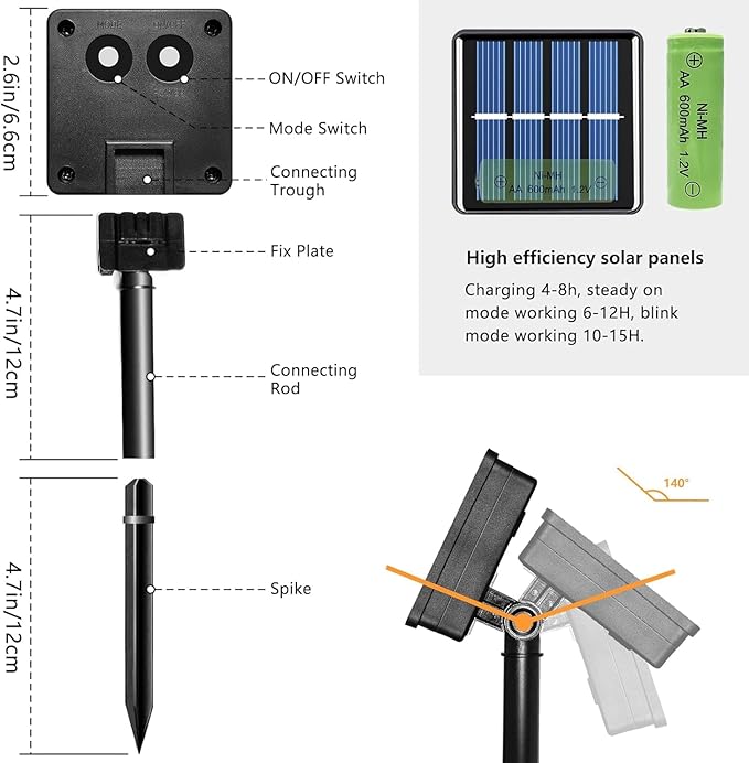 - 【Solar Powered & Auto On/Off】: This outdoor string lights charging by solar energy, no extra electric cost, and no need to replace the battery. It can work up to 10~15 hours at night after fully charged under sunshine for 4~8 hours. Light sensor controls the multicolor solar lights charging at daytime and auto on at dark.