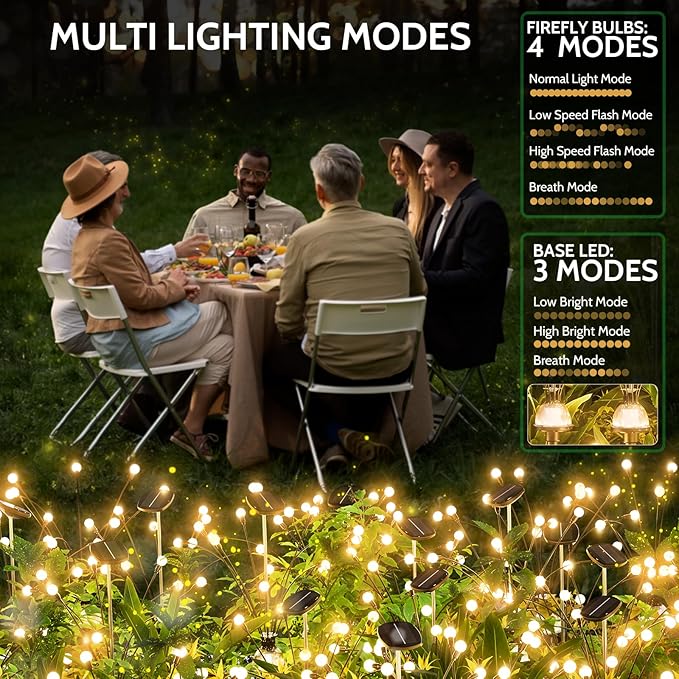 - 【Superior Performance and Unique Design】Our solar firefly lights have 9 larger and brighter premium LED firefly bulbs. In addition to the 9 firefly bulbs, there is an illuminating LED light at the bottom which is composed of 6 LED bulbs with warm white lighting to illuminate the pathway. The solar firefly lights can light up for 10-12 hours during all night after a 6-8 hours solar charged in day even if it is a cloudy or rainy day.