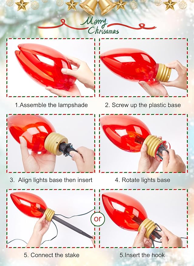 - New Strawberry Jumbo C9 Pathway Lights Christmas: Total 13 feet long for each pack, included 11 feet lighting length. 2 pack green wire christmas string lights with 10 C9 lights, 10 multicolored super jumbo C9 bulbs, 10 hooks, 10 stakes, and 1 spare fuse and bulbs. External super jumbo C9 bulb size: 9.5 x 4.7 inches, and each bulb is 30 inches apart, 10.8 inches pathway markers, E17 socket compatible. Create a festive atmosphere with these jumbo christmas lights outdoor.