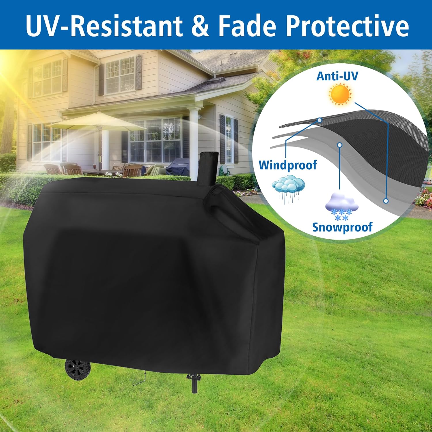 - Material: The waterproof grill cover is made of 600D high-density oxford fabric with an internal PVC coating, can protect your grill from strong winds, storms, sunlight, snow, dust, and debris, durable and long-lasting. Has good UV resistance, color fastness, waterproofing, low temperature resistance, and tear resistance functions.