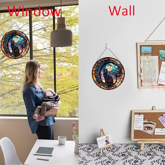 - 【Easy to Use】This stained glass window hanging painted maple leaf and black cat, vivid and full of vitality. Ideal for those who love pastoral and nature, and seek a return to original nature! You can hang it in the position you want to decorate,it's a great home decor.