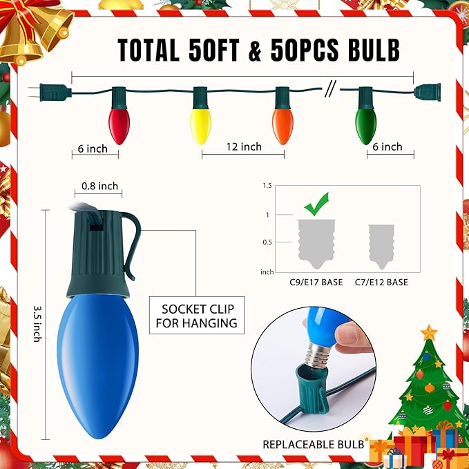 - 50 FT Vintage Outdoor Christmas Lights: 50 feet length with 50 +2 C9 bulbs (2 spare), E17 base light sockets.Multicolor
