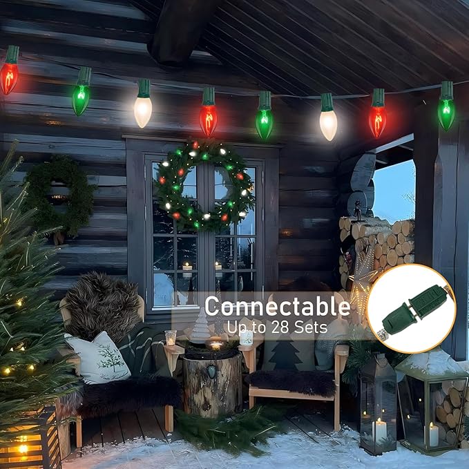- Flexible & Expandable: Create stunning light displays with red, green and white christmas lights that offer seamless end-to-end connectivity. The secure E17/C9 candelabra socket base allows you to link up to three strands together easily, perfect for covering large areas and making your festive decorations truly stand out.