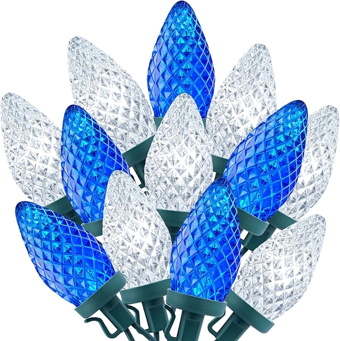 - 【 Brilliantly Bright Glow 】- These Christmas light strings feature large, faceted C9 bulbs made from durable polycarbonate, offering good brightness, colour saturation, ruggedness and reliability. Built-in SMD LED creates vivid lighting effects; the diamond facet hole design prevents stagnant water. Bulbs with vibrant colors will never fade, chip or crack