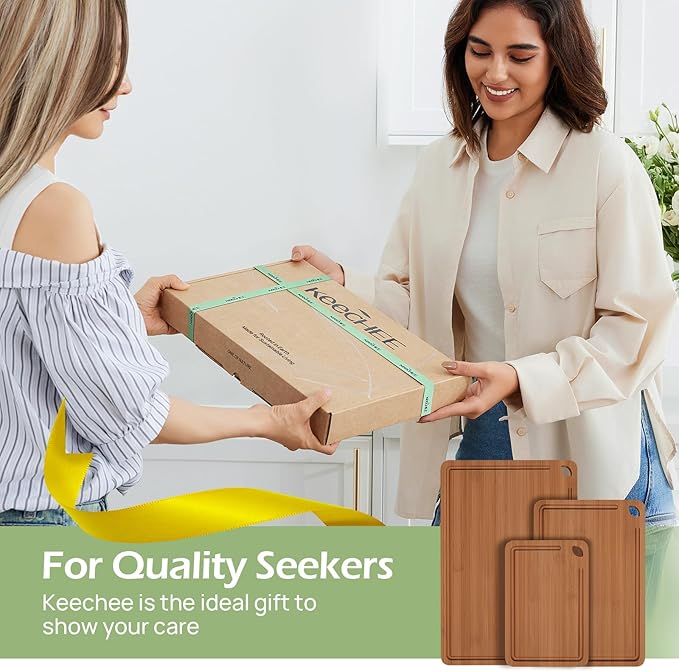 - ๐๐๐ง๐๐๐ข๐ญ ๐๐ฎ๐ซ ๐๐จ๐ฆ๐ - Keechee's cutting board set is crafted from sustainably harvested quality bamboo forests(Bamboo grows quickly and a single bamboo can be harvested multiple times). Known for its natural strength and eco-friendliness, our bamboo provides a durable and environmentally responsible choice for your kitchen.