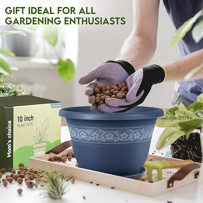 10 Inch Plant Pots with Drainage Hole - Lightweight Flower Pots for Herbs and Flowers - Home Decor Plastic Planters for Indoor Outdoor Plants- Pack of 4 (Blue, 10 inch)