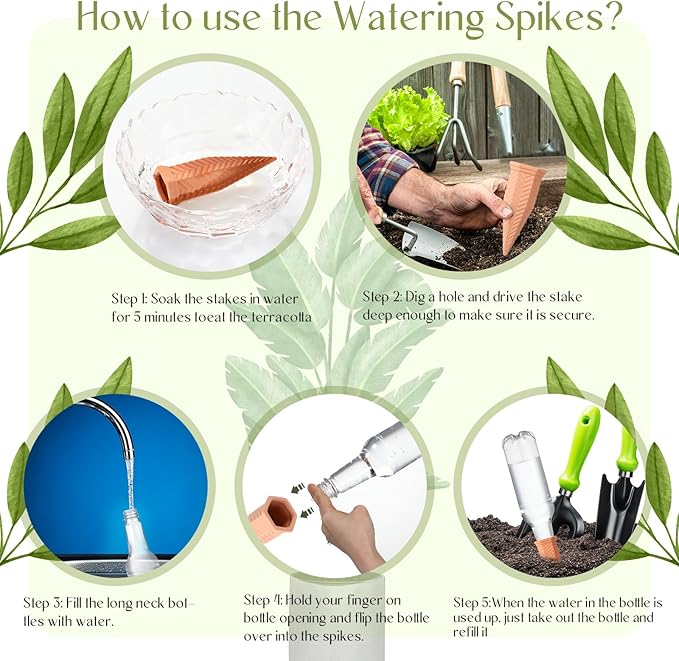 - Quality Materials: the self watering spikes is made of terracotta; Due to its characteristics, it is a little fragile, please handle it with care; Its spiral appearance is more conducive to easy penetration into the soil; The plant watering bottle is made of PET, which is sturdy and durable, please note: it is necessary to drill a few holes in the bottom of the bottle or cut the tail of the bottle to maintain airflow