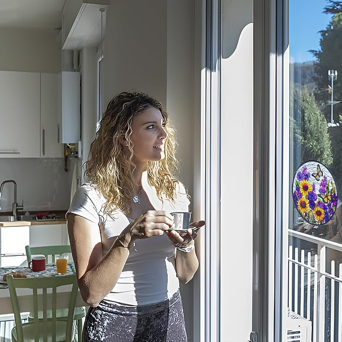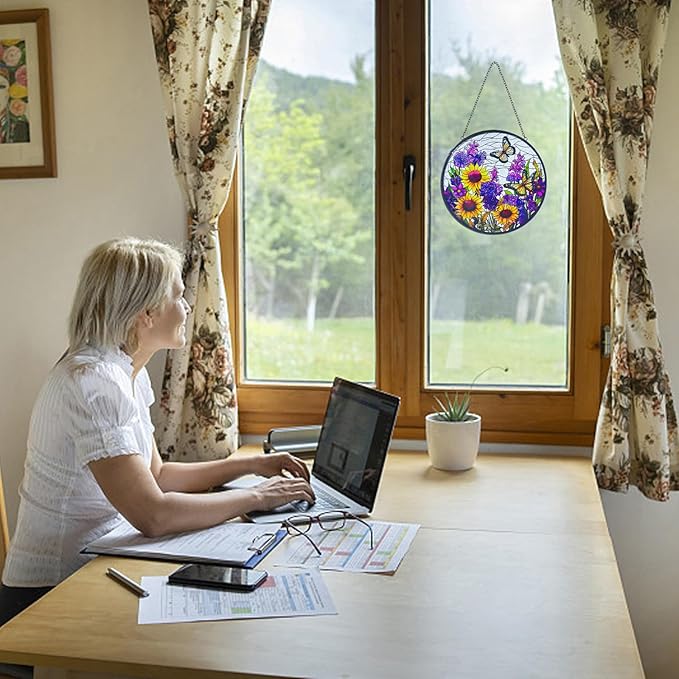 Butterfly Sunflower Stained Glass Suncatchers - Handcrafted Round Glass Art for Windows & Doors Décor - Decoration for Home Garden Christmas Party Wedding Housewarming Gifts