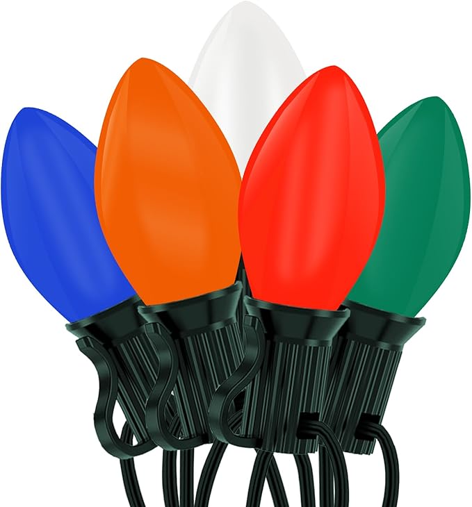 - Outdoor Christmas String Lights: 25FT outdoor chrismas lights set includes 25 vibrant C7 ceramic multicolor bulbs (red, green, blue, white, and orange) evenly spaced along a 25-foot durable green wire, providing ample length for both indoor and outdoor decorating.
