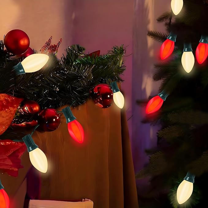 - Festive C7 LED Red and White Christmas Lights: Create a cheerful and classic holiday ambiance with these 25FT C7 LED red and white Christmas lights. The alternating red and white bulbs add a traditional touch to your Christmas tree, garlands, or outdoor displays. LED outdoor string lights perfer for decorating your home, store, backyard, garden, patio, wall, gate, yard, Christmas tree, window, party