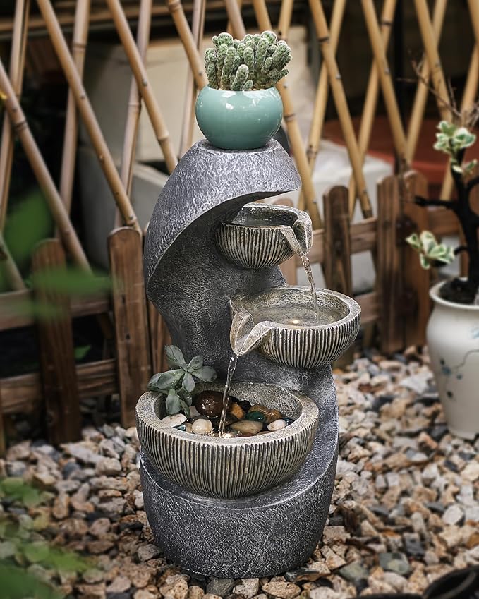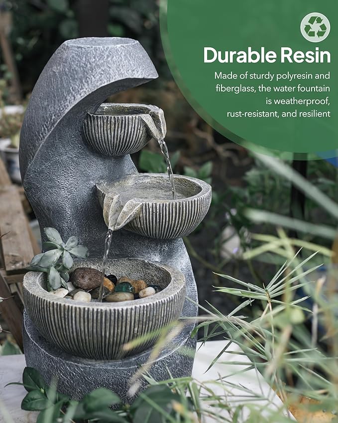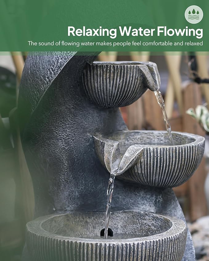 - 【Modern Flowing Water Design】With a modern design that incorporates natural elements, this outdoor water fountain features a 3-layer bowl-shaped design and a 1-layer stacking tower water flow design that mimics the sound of a real waterfall. The soothing sound of flowing water will help relieve stress and create a relaxing atmosphere in your surroundings.