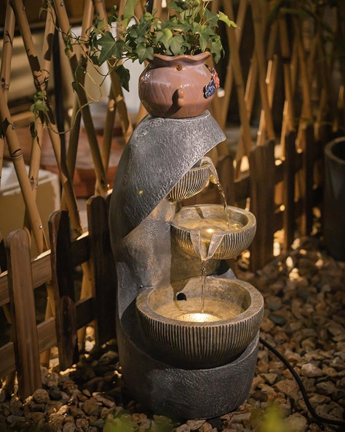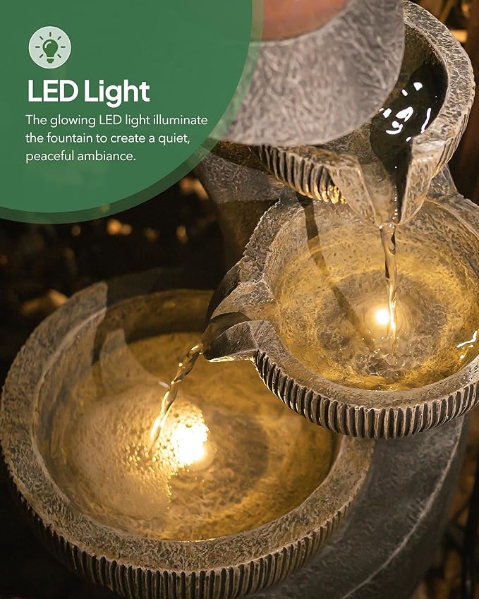 - 【Warm LED Lights】This garden fountain equipped with three built-in warm golden lights, waterfall creates a warm and inviting ambiance. At night, the lights will enhance the beauty of the waterfall fountain.