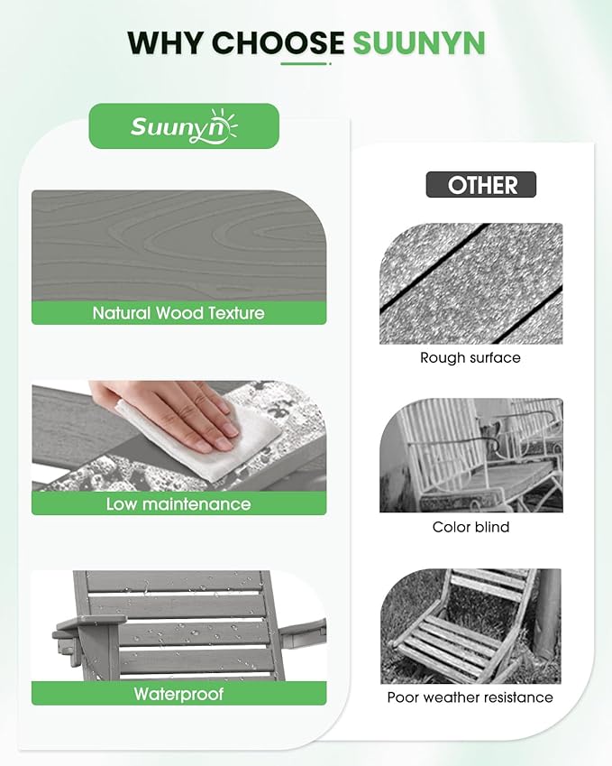 - Weather-Resistant: Made of high-quality HDPE material with wooden texture, SUUNYN sturdy adirondack chair offers excellent weather resistance, resisting fading, splitting, cracking, chipping, peeling, and rotting in harsh conditions. Plus, its easy-to-clean surface and low maintenance