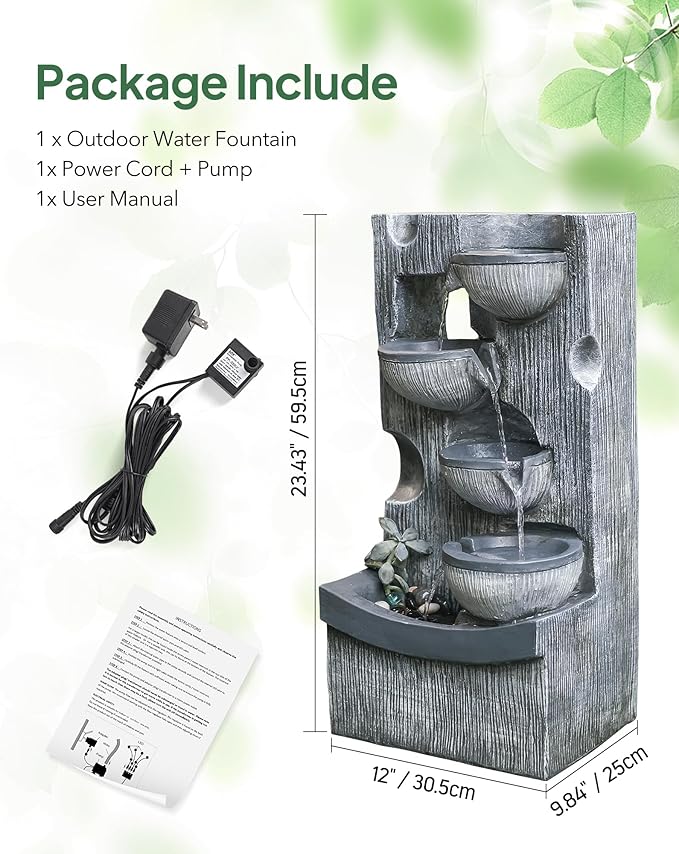 - 【Ideal Size】 Our garden fountain measures 12" L x 9.84" W x 23.43" H. The modern design blends seamlessly with nature and is lightweight enough to be easily moved around. The package includes 1 outdoor fountain, 1 light plug, 1 water pump plug, and 1 instruction manual.