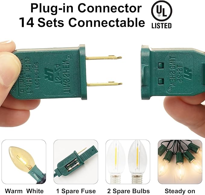 - 【Energy Saving LED Lights】:Christmas pathway lights have E17/C9 candelabra socket base, 0.6W C9 LED light bulbs. Christmas lights are energy saving and long lasting. Even if one light goes out, the rest will remain illuminated. The fuses are rated at 5A, 125V. If the entire string of lights does not work, you have the option to replace the fuse and give it another try.