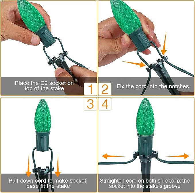 - 2 Pack C9 LED Pathway Lights - MAINDECO C9 Christmas walkway lights are 30 feet long in total which contain 20 Multi-colored C9 LED SMD strawberry faceted bulbs with 18 inches spacing, 20 Stakes, E17 base sockets. After installing the ground stakes, it can be fixed in the ground to add Christmas holiday lights to your yard, garden and pathway, etc.