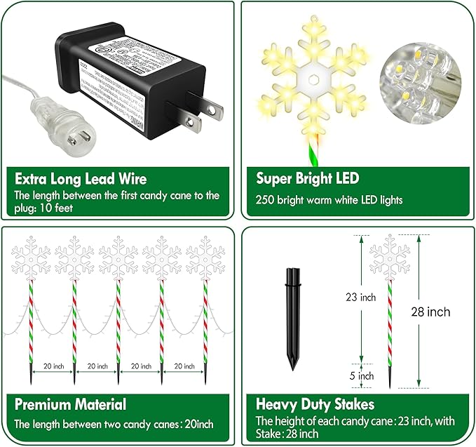 - 【28 Inch New Design Outdoor Christmas Snowflake Lights with Light Strings】 This is a upgraded Christmas light featuring large snowflake shapes above the candy canes. Each light is connected by light strips in between, each interval has 10 LED, more LED, super bright, add a romantic and cozy touch to your holiday display.