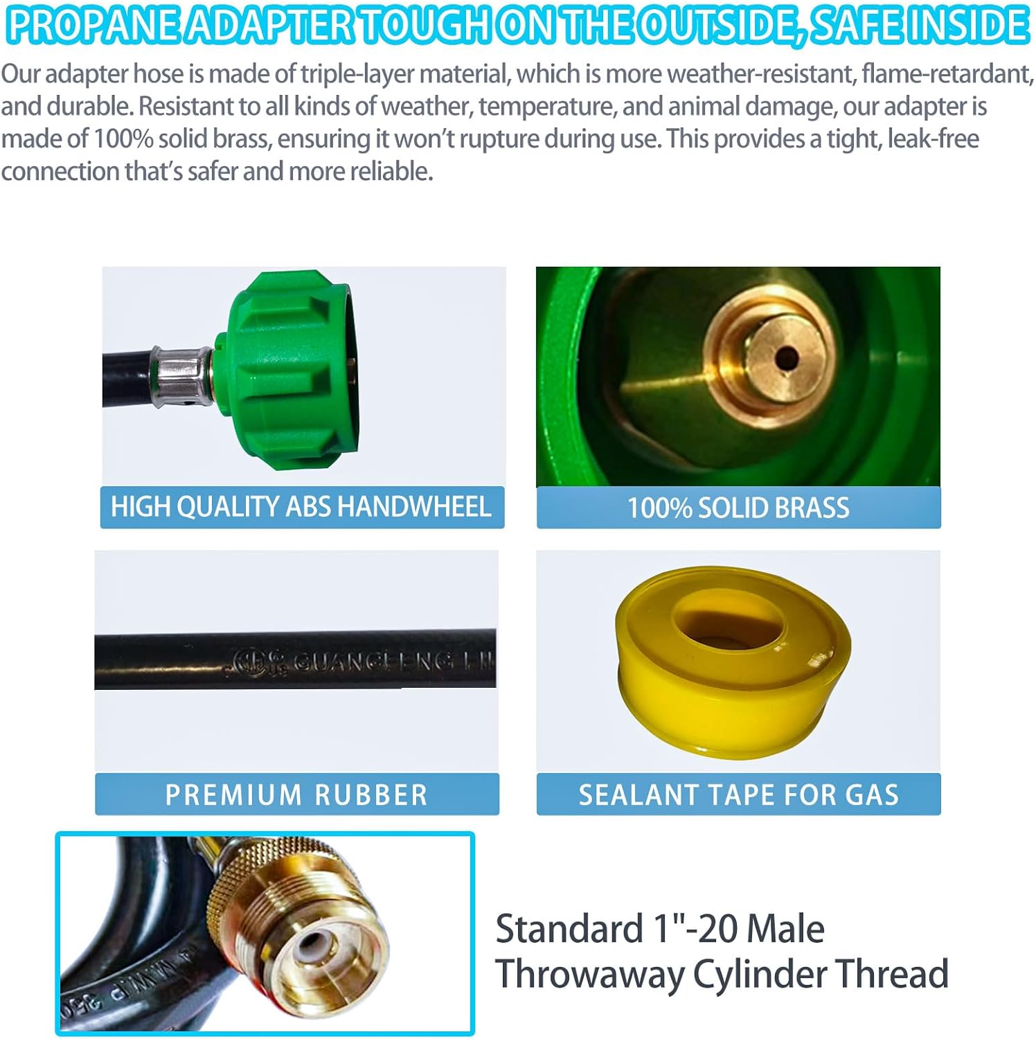 - Propane Adapter Tough On The Outside, Safe Inside: Our adapter hose is made of triple-layer material, which is more weather-resistant, flame-retardant, and durable. Resistant to all kinds of weather, temperature, and animal damage, our adapter is made of 100% solid brass, ensuring it won't rupture during use. This provides a tight, leak-free connection that's safer and more reliable. Our propane adapter hose is the perfect companion to the Weber camping grill.