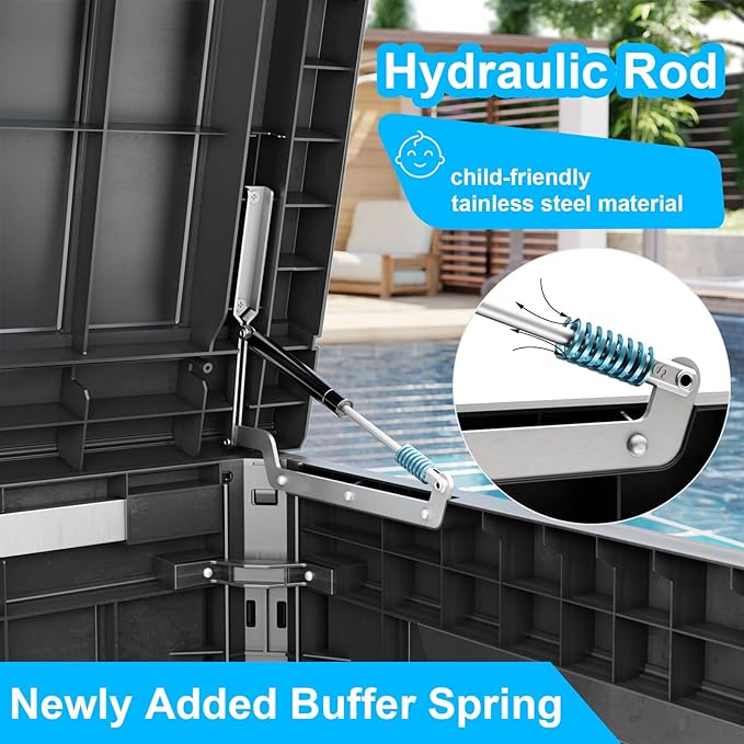 - Safety design: Each deck box has lockable holes (not included) for added security; in addition, the box is equipped with a hydraulic stand, which allows easy opening and slow closing and prevents hand pinching. The outdoor waterproof deck box has built-in handles on both sides, ensuring easy grabbing and moving