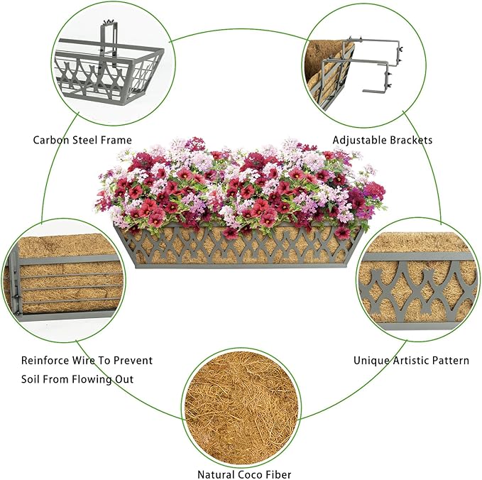 2 Pack 24 Inch Window Boxes Planters Railing Planter Box with Adjustable Brackets for Porch Fence Patio Balcony Hanging Flower Baskets with Coco Liners for Outdoor Garden Decor - Grey