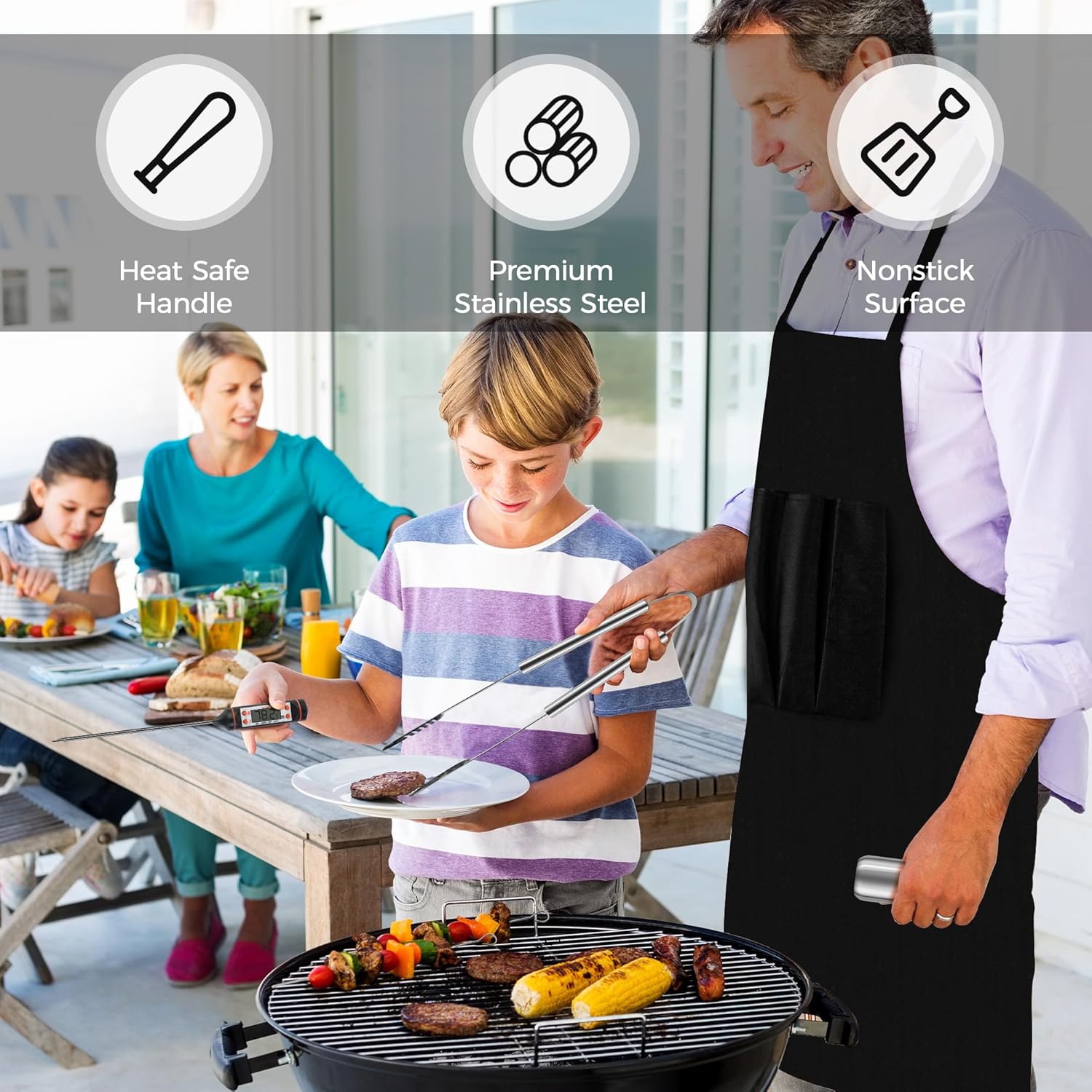 - COMPLETE GRILLING ACCESSORIES: Our 32-Piece BBQ Tool Set includes essential grill accessories like apron, tongs, basting brush, 4-in-1 spatula, cleaning brush, fork, knife, meat thermometer, heat-resistant gloves, bottle opener, salt and pepper shakers, meat claws, corn holders, and skewers—all neatly packed in a handy carrying case, ensuring you're fully equipped for backyard barbecues or camping trips