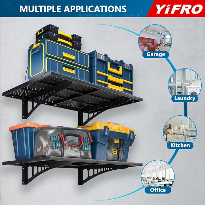 - HEAVY DUTY CONSTRUCTION: YIFRO garage wall shelving takes its cues from architectural frame construction, with a 2x3 ft individual bracket load capacity of 250 lbs. and a total of 500 lbs. for 2 shelves, which makes it easy to store most of the items in your garage.