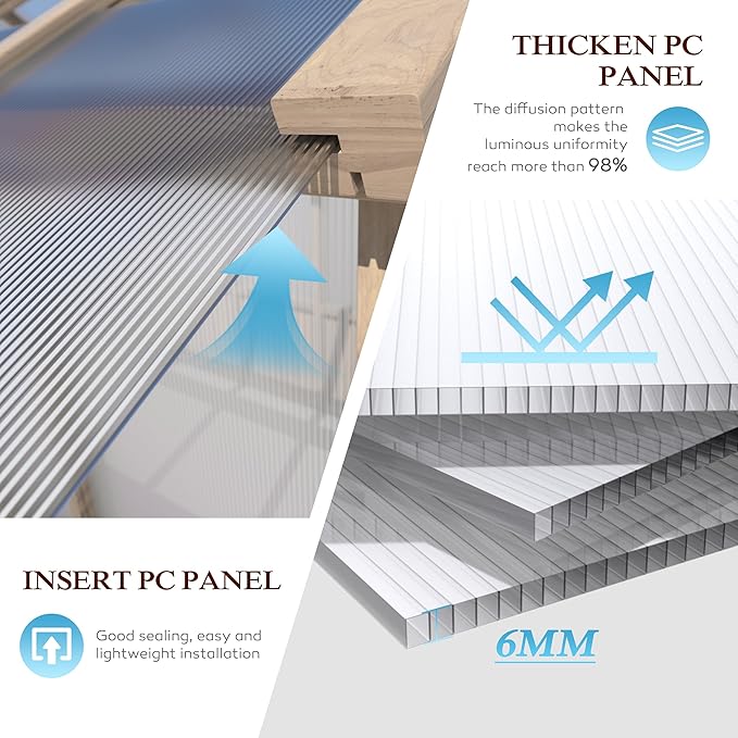 - Upgraded Polycarbonate Panel: Yardenaler greenhouse kit uses multi layers polycarbonate panel to provide high light transmission and UV protection. They allow light transmission for plant growth while blocking over harmful UV rays. It is beneficial for the better growth of your plants and herbs