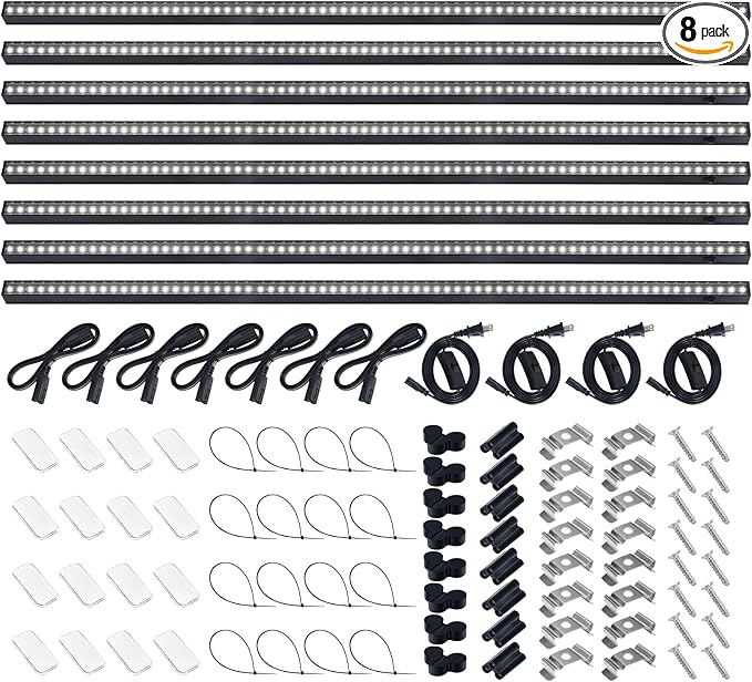 - What You Get: 8 x Barrina T5 Grow Lights, 4 x Power Cords with ON/OFF Switch, 7 x Connecting Cords (20''), 8 x Small Connectors, 16 x Installation Clips, 16 x Magnetic Bars with Double-Sided Tape, 24 x Cable Ties, 8 x Dustproof Cap