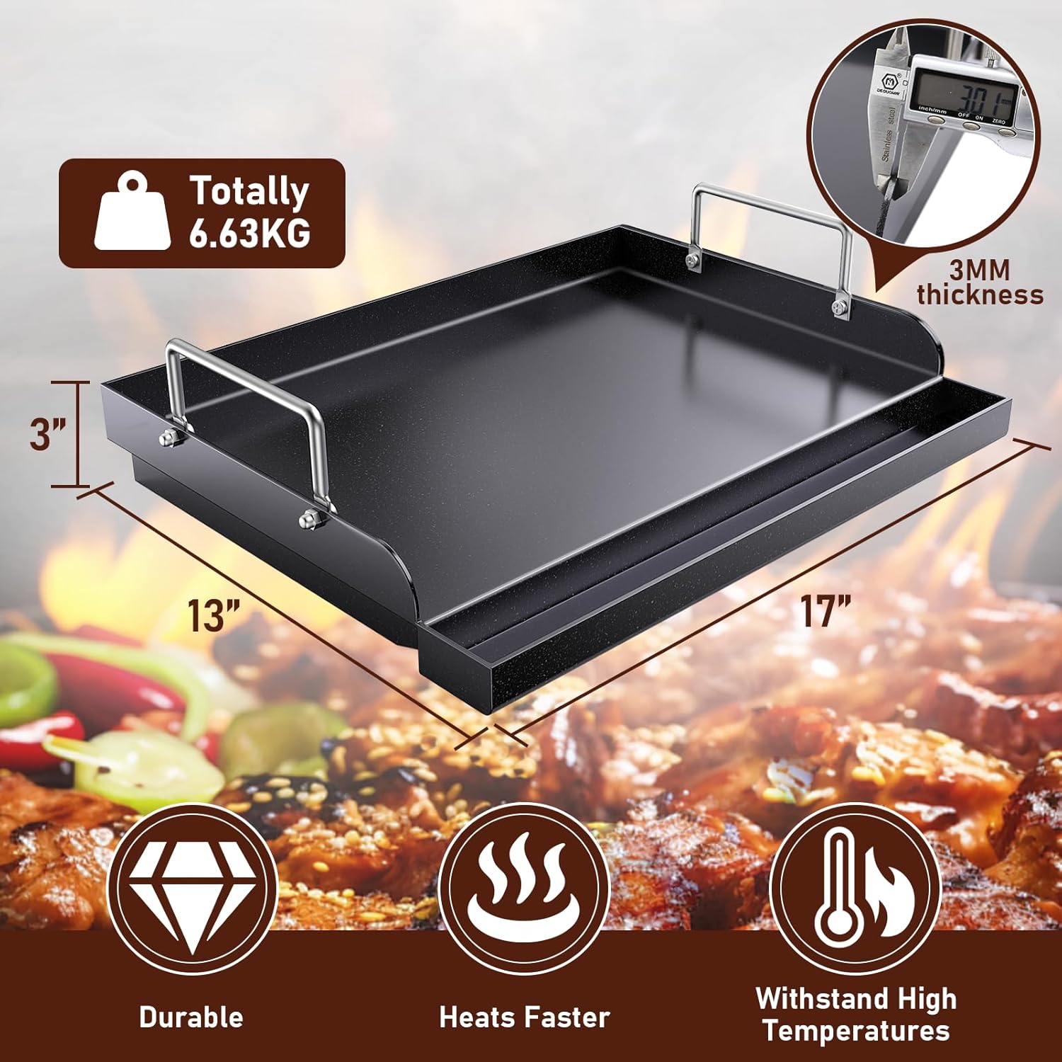 - 【Universal Compatibility 】Elevate your grilling game with the Uniflasy Universal Griddle, designed to fit most gas grills, charcoal grills. Dimension- 17 x 13 inches, this griddle is perfect for large meals, from sizzling steaks to pancakes and veggies. It's compatible with popular grill brands like Weber, Nexgrill, Charbroil, Kenmore, Camp Chef, and many more. Be sure to check your grill's dimensions before placing your order for a perfect fit