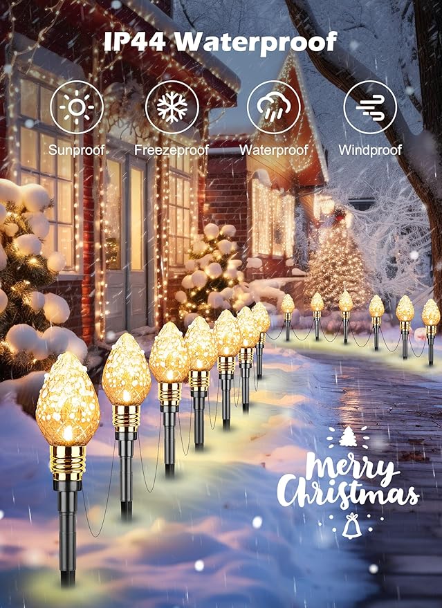 - Waterproof Christmas Yard Lights Decoration: These Christmas walkway lights for the yard comply with the rain test of UL certification. These holiday decoration lights are wonderful decorations for home, patio, lawn, garden, bistro, pub, cafe, restaurant, shopping center, supermarket, New Year, birthday, gathering, disco ball party, dinner party, evening party, the plug is not waterproof, it should be protected from the rainy day